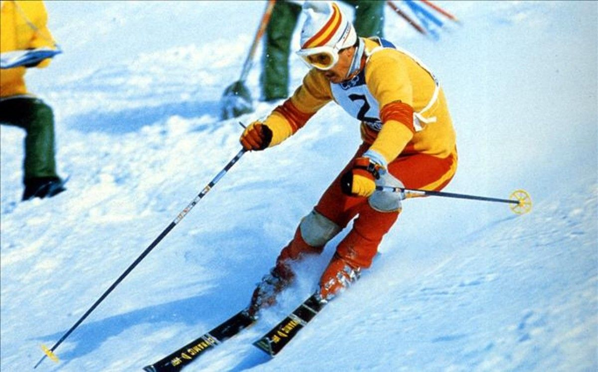 Paquito Fernandez Ochoa en la bajada que consiguió la primera medalla olímpica para el deporte de invierno español. En Sapporo. 1972. Con Guantes Arribas